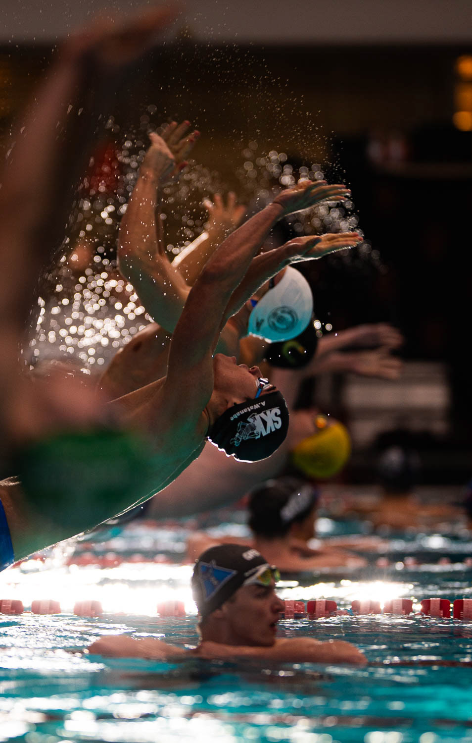 Jag gick runt i hallen under insimmet, letade vinklar, ljus och uttryck. Inzoomad med mina teleobjektiv kunde jag komma nära- riktigt nära utan att störa loppen inför start. Jag var nyfiken på den stunden av koncentration som bryts av startljudet, ett horn som smäller av och släpper iväg startfältet. Men kameran ovanför vattenytan är det den bästa stunden att fånga ansikten och uttryck och blickar. Därefter kommer plasket och ropen från publiken - följt av sparkar under ytan och första andetaget vid markeringen på 15m, knappt 8 sekunder senare.